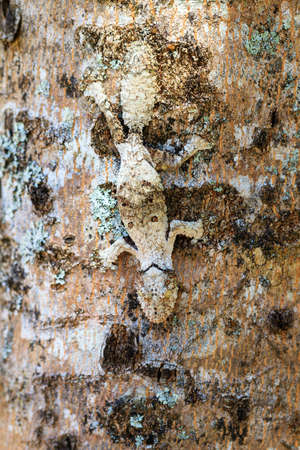 Satanic Leaf Tailed Gecko (Uroplatus phantasticus) camouflaged on a tree in Madagascar