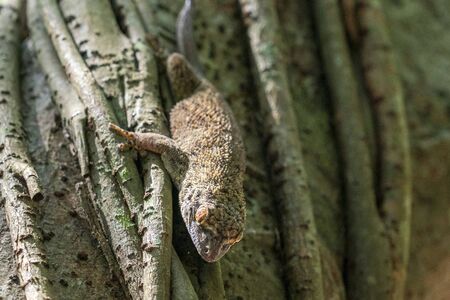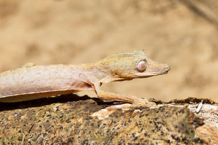 A Halmahera giant gecko is sunbathing. This endemic reptile from Halmahera Island, Indonesia has the scientific name Gehyra marginata.