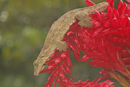 A Halmahera giant geckos basking in a wildflower. This endemic reptile from Halmahera Island, Indonesia has the scientific name Gehyra marginata.