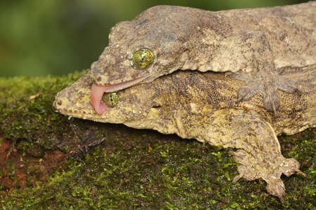 A pair of Halmahera giant geckos are mating. This endemic reptile from Halmahera Island, Indonesia has the scientific name Gehyra marginata.