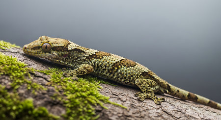 Curious gecko is resting on a gray surface, its intricate skin patterns and captivating gaze drawing the viewer in.