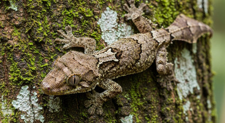 A Leaf-tailed gecko (Uroplatus fimbriatus) perfectly camouflaged on a tree trunk. Its unique leaf-like tail and body shape allow it to blend into its surroundings. Andasibe Reserve, Madagascar.