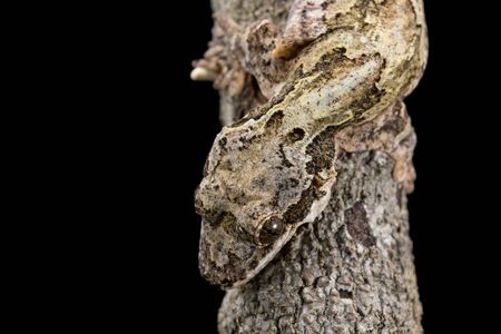 Gargoyle Gecko, Rhacodactylus auriculatus staring Isolated on black background. Native to New Caledonia