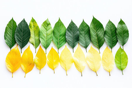 Green and yellow leaves arranged in a gradient row on white background showing transition from summer to autumn. Botanical nature concept