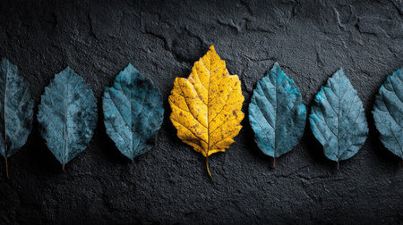 An artistic arrangement showcases colorful leaves against a dark, textured background. The central yellow leaf stands out among a row of blue leaves. The overhead lighting highlights the leaf's textures and colors, creating visual appeal. Suitable for various design projects and commercial applications.