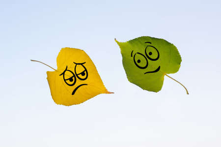 Green and yellow leaves with a picture of happy and sad faces on the window on the background of diffuse dull city.