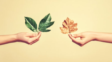 Two hands holding a green leaf and a dry leaf representing life cycle