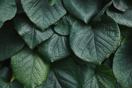 Dark green tropical leaves background – Toned nature shot of some forest greenery – Dramatic foliage decoration