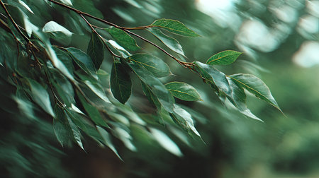 Lush green leaves display rich textures as they catch soft light, creating a tranquil vibe in a peaceful outdoor setting surrounded by nature.
