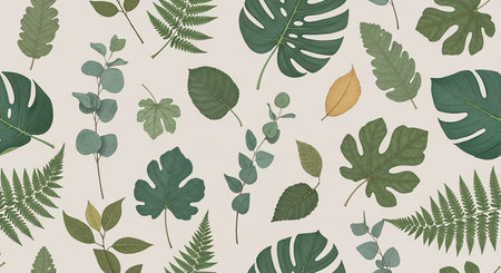 A collection of various green and yellow botanical leaves and fern fronds are scattered across a light beige background, creating a natural and...