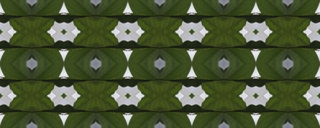 A repeating geometric pattern formed by lush green banana leaves with visible veins and textures.