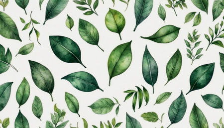 Soft natural green leaves are scattered across a clean background, creating an elegant botanical pattern ideal for backgrounds or design elements.