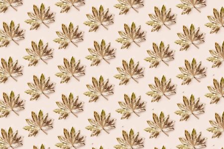 Beautiful Leaf Pattern. Leaves are painted in golden and copper metallic paint on pink background. Autumn minimalism. Isometric flat lay.