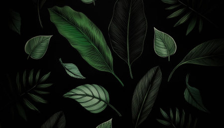 A striking composition of tropical leaves against a black background, offering a dramatic and modern aesthetic with rich, vibrant greens and clean, minimal design