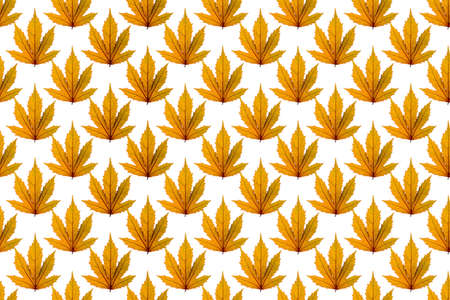 Autumn yellow leaves on gray background, fall wallpaper. Top view Flat lay.