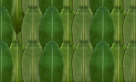 Top view. Green banana leaves background. Overlaid all over the area. Tropical plants of Asia.