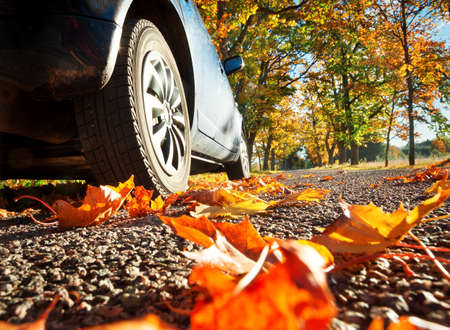 Car on the road in the autumn forest. Fallen leaves on the ground.
