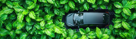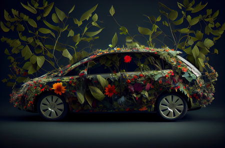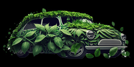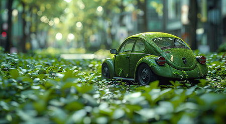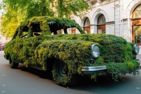 Eco friendly electric car covered moss and leaves, symbolizing sustainability and nature. image conveys harmonious blend of technology and environment, showcasing unique perspective green