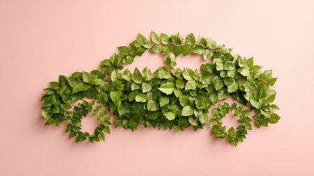 An eco-friendly car is represented by green leaves, creating a silhouette against a soft pink background. The image has a clean, overhead composition. The texture is natural. This graphic may be used for environmental, transportation, or sustainability themes. It would be appropriate for commercial and editorial purposes.