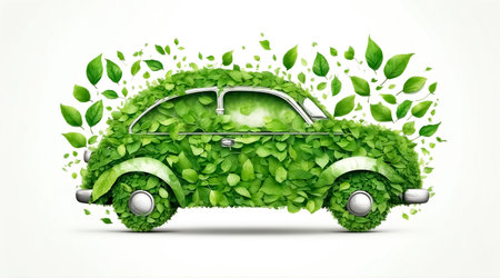 A car is creatively designed with various shades of green leaves, showing an eco-friendly theme.