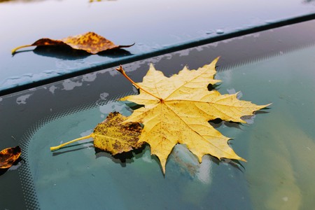 Autumn time: yellowed fallen leaves on the windshield of the car.