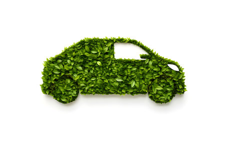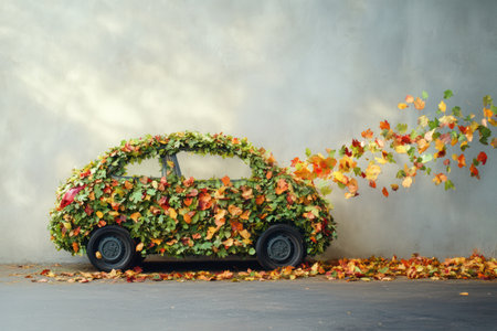 Toy car is covered in green leaves, symbolizing eco friendly transportation and sustainability