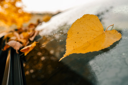 Autumn yellow leaves on car's hood and glass with natural water drops on the blurred background. Fallen leaves and rain drops on a car windshield with city in the background.