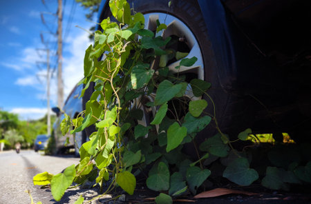 Green leaves cover on the old safari car in rainforest background. Life is journey concept.