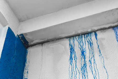 Streaks of liquid spilled blue paint down the white plaster wall abstract pattern dirty background design.
