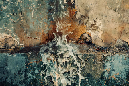 A captivating image of water spraying from a metal faucet mounted on a rustic wall, showcasing urban decay blending with nature. The vibrant teal and brown colors enhance the visual appeal.