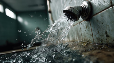 Close-up view of water flowing from a metal faucet in an old bathroom. The image captures splashes and reflections on grimy tiles, evoking a sense of age and neglect.