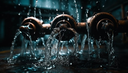 Flowing water splashing on steel equipment, refreshing the factory machinery generated by artificial intelligence