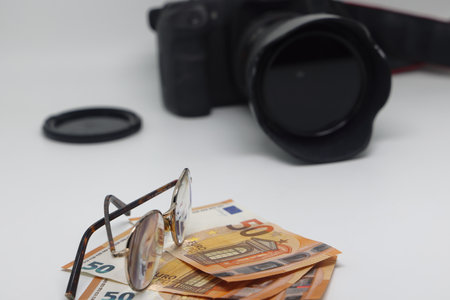 Office desk workplace with camera, glasses and banknotes. Earnings on photo stocks