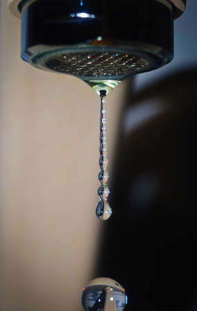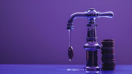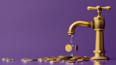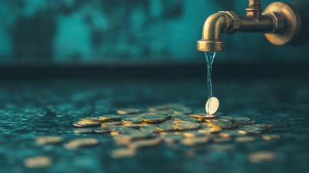 A close-up shot of water dripping from a brass faucet onto a pile of coins. This imagery symbolizes financial loss and economic challenges in a creative context.