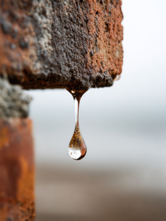 A clear droplet of water forms on the edge of an aged brick, capturing the moment before it falls in a calm and peaceful setting.