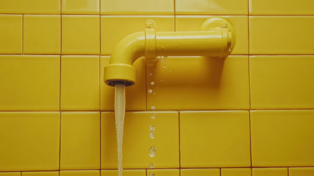 A striking image of a yellow pipe discharging water against a vibrant yellow tiled wall, showcasing a contemporary bathroom design. Ideal for highlighting modern plumbing and cheerful interior aesthetics.