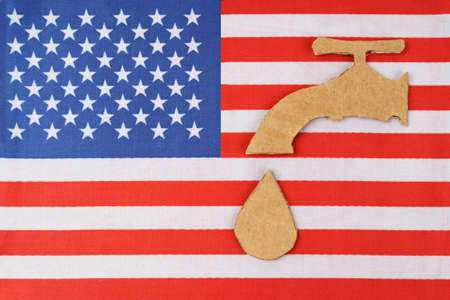 The concept of saving water resources. On the US flag, the figure of a crane with a drop of water