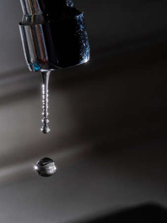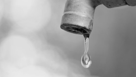 Black and white image of a dripping faucet with a water droplet, symbolizing water conservation and plumbing.