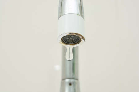 Old leaking faucet with stone and calcium sediments due to hard water.