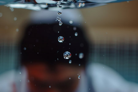 A womans face is mirrored in the water, creating a striking visual reflection, Sweat drop falling from a karate practitioner's forehead, AI Generated