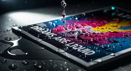 Macro photography of water drops falling on colorful text card dreams are liquid art