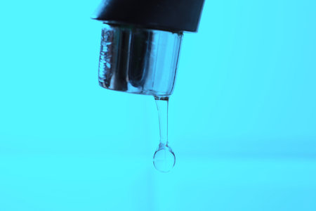Serum drops glisten on a luminous forehead, showcasing a unique beauty technique with a focus on skin care and a surreal environment under glowing lights.