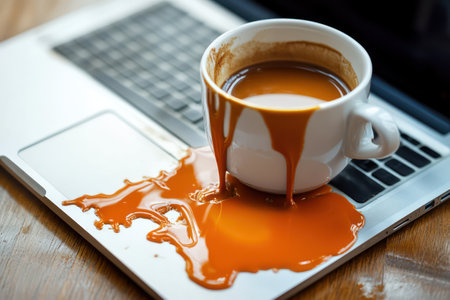 Disaster moment as coffee spills on laptop, representing accidents, tech issues, and work-from-home hazards.