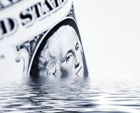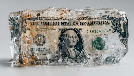 A crisp dollar bill gradually dissolves in frozen water, with droplets trickling down, symbolizing financial decline or economic cooling.