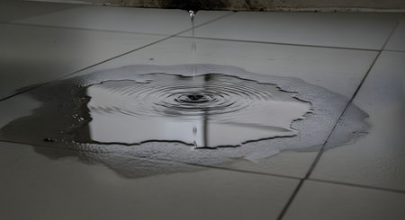 Water drips from a ceiling leak, forming a puddle with concentric ripples on a tiled floor in a dark room. This image illustrates home damage, plumbing problems, a leak, or the need for repair.