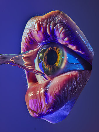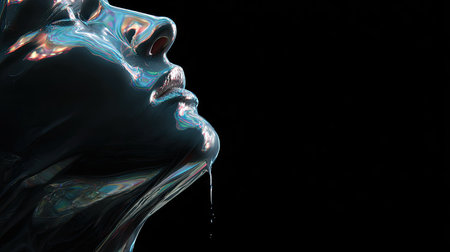 An abstract artwork showcases a face rendered with fluid, metallic material. The subject appears against a dark backdrop, highlighting the glossy textures and reflective properties of the liquid-like form. The piece's composition and color palette are suitable for various creative or commercial projects.