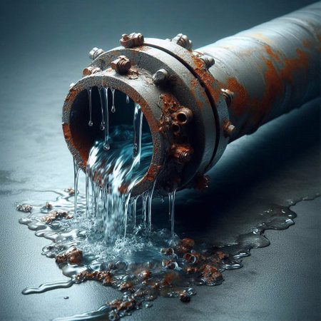 Thick black liquid escapes a pipe, creating ripples as it descends into a dimly lit surface in an industrial setting.