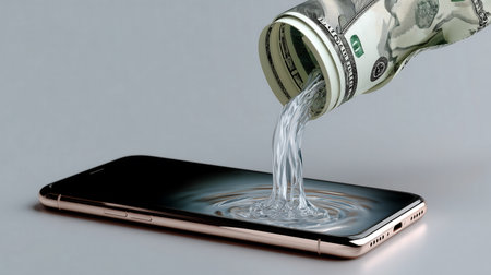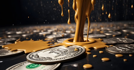 A conceptual image showcasing a splash of golden liquid over coins and a banknote, symbolizing wealth and liquidity. The fluid dynamics suggest the volatile nature of finance. AI Generative