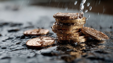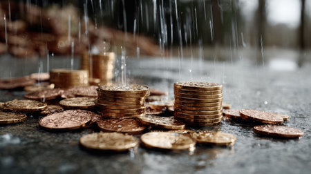 A dramatic scene featuring shiny coins stacked and scattered on a wet surface under falling rain, symbolizing wealth, abundance, and the connection between nature and finance.