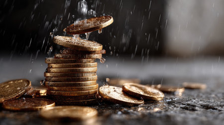 Close-up image of stacked coins on a wet surface with water splashing. This visually stunning representation showcases financial themes and investment concepts.